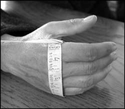 Für die Ermittlung der Handschuhgröße wird der Handumfang an der breitesten Stelle der Hand über den Fingerknöcheln ohne Daumen gemessen und anhand der gemessenen cm die richtige Größe von der Handschuh - Größentabelle abgelesen.