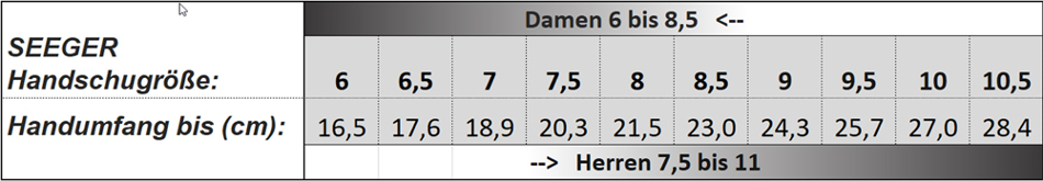 SEEGER Lederhandschuhe werden nach Ursprung des Handwerks traditionell in französischem Zoll angegeben.